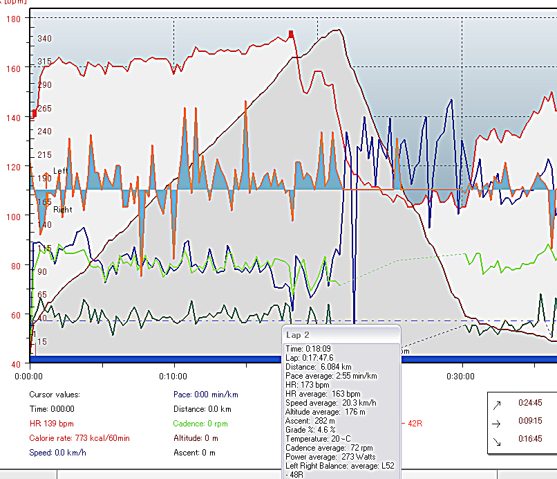 平均速度20.3km/h、MaxHR 173,AveHR 163,AvCad 72,AvPow273W,MaxPow413W。