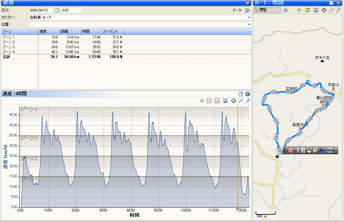 2周目、なんといちばんきつい下宮田ののぼりで自分が先頭・・・はやくのぼりきりたい一心でくるくるペダルをまわしてのぼったらペースを乱したようで・・・すみません。3周目の下りでH尾さんに「下宮田20km/hでのぼるなよ〜」「だって苦しいから早くおわりにしたいんだもん」