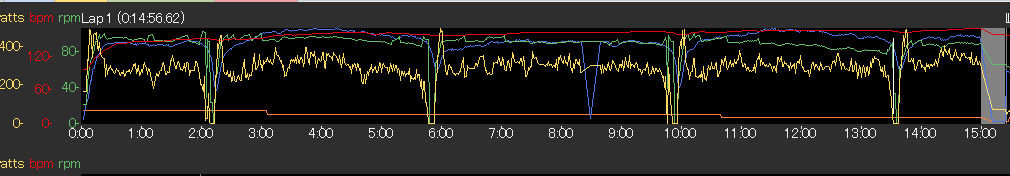 タイム14分38秒。296W。まだ300Wに届かず・・・ターンがあと二回へって平均出力あがるか??41.1km/h。これもターン二回へってどこまであげられるか??
