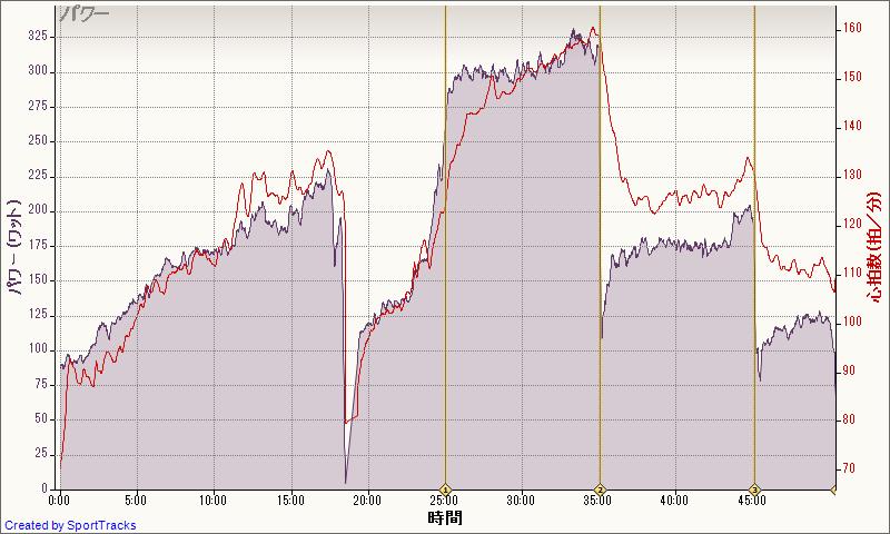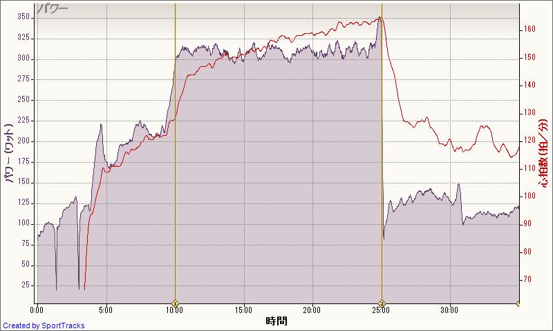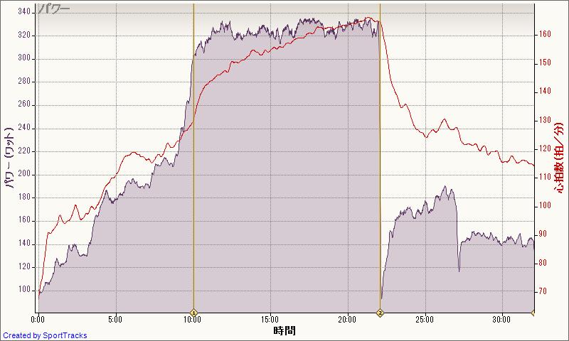 15分での自己ベストは334W、ただしのぼりでの計測なので、平坦、DHポジションだとここまでは難しそう。でも最低300W、できれば310Wくらいはいけないものか・・・