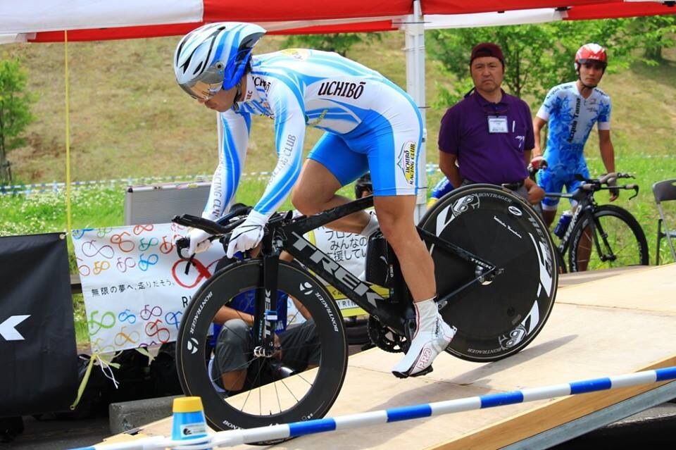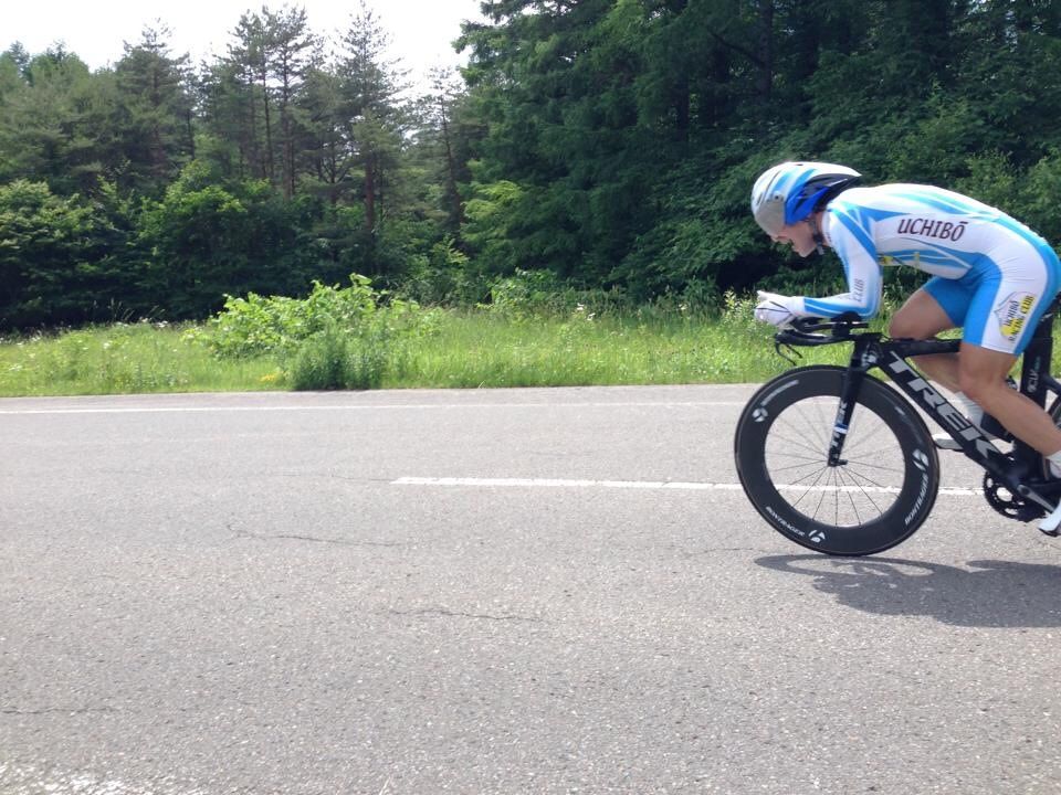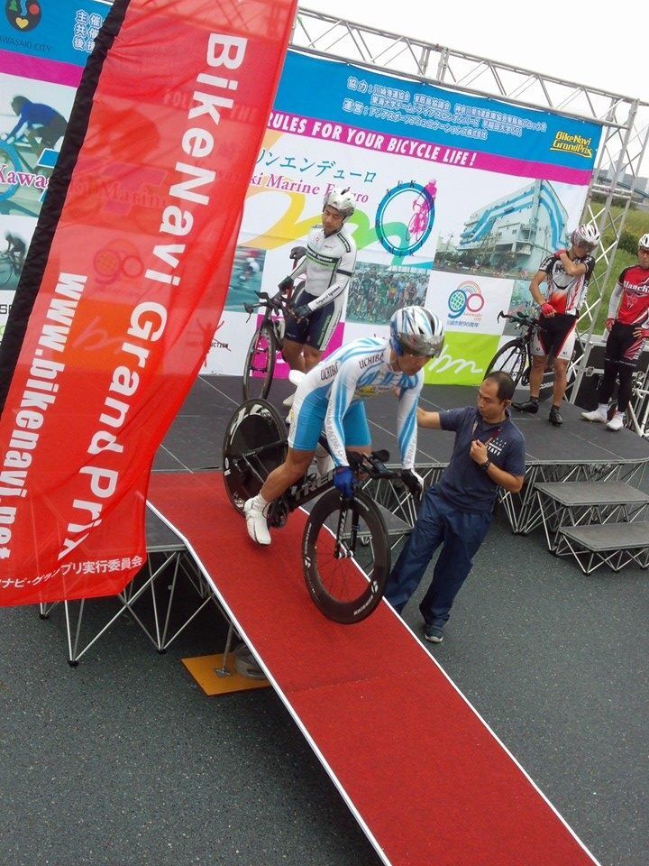 最初の直線に入って前走者一人見えて、Uターンしてから復路の直線で一人ぬき、二人目抜こうとしたら、道ガタガタ。でも踏んで抜いて、三人目ぬいて二周目。