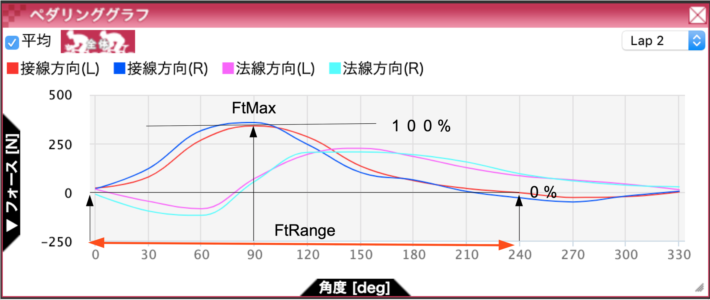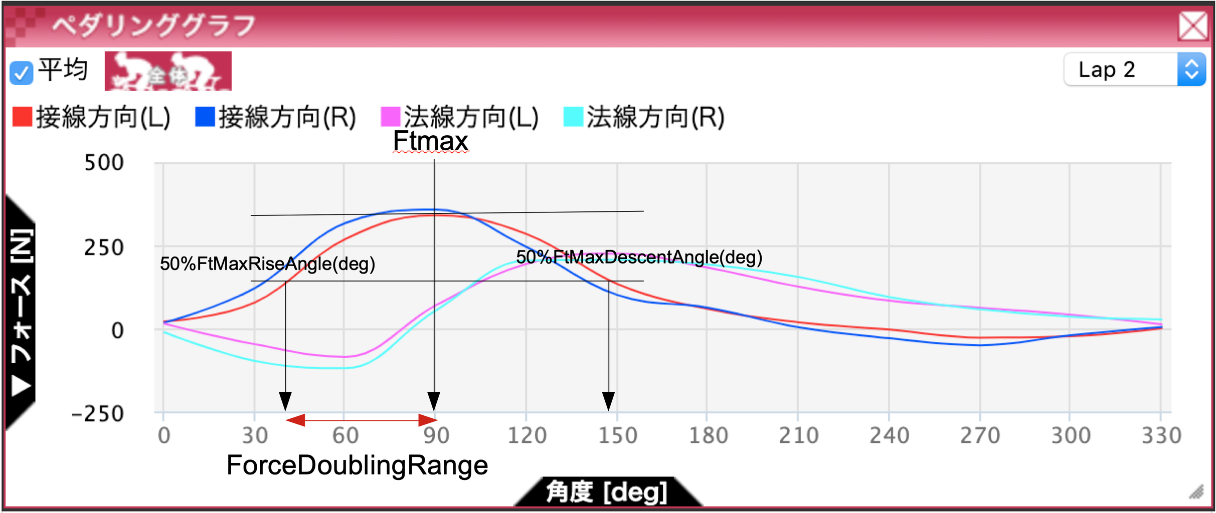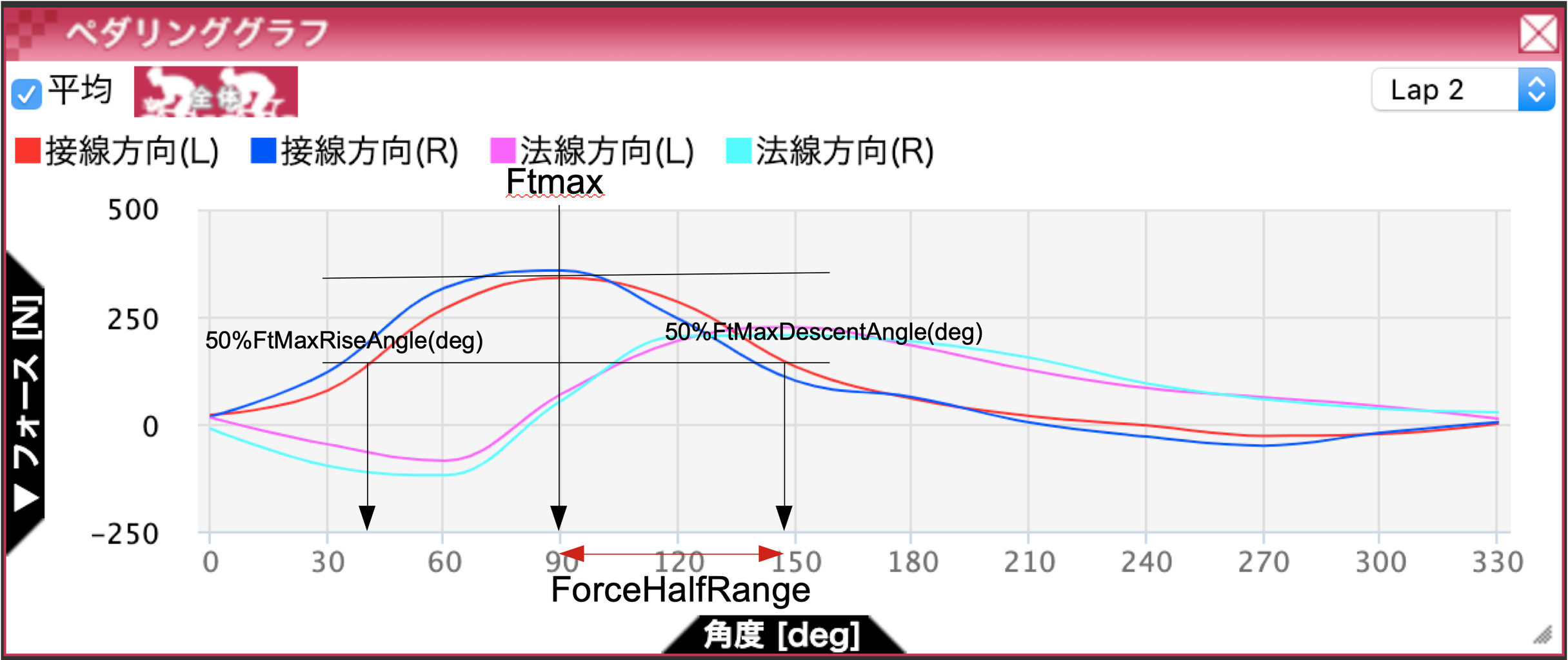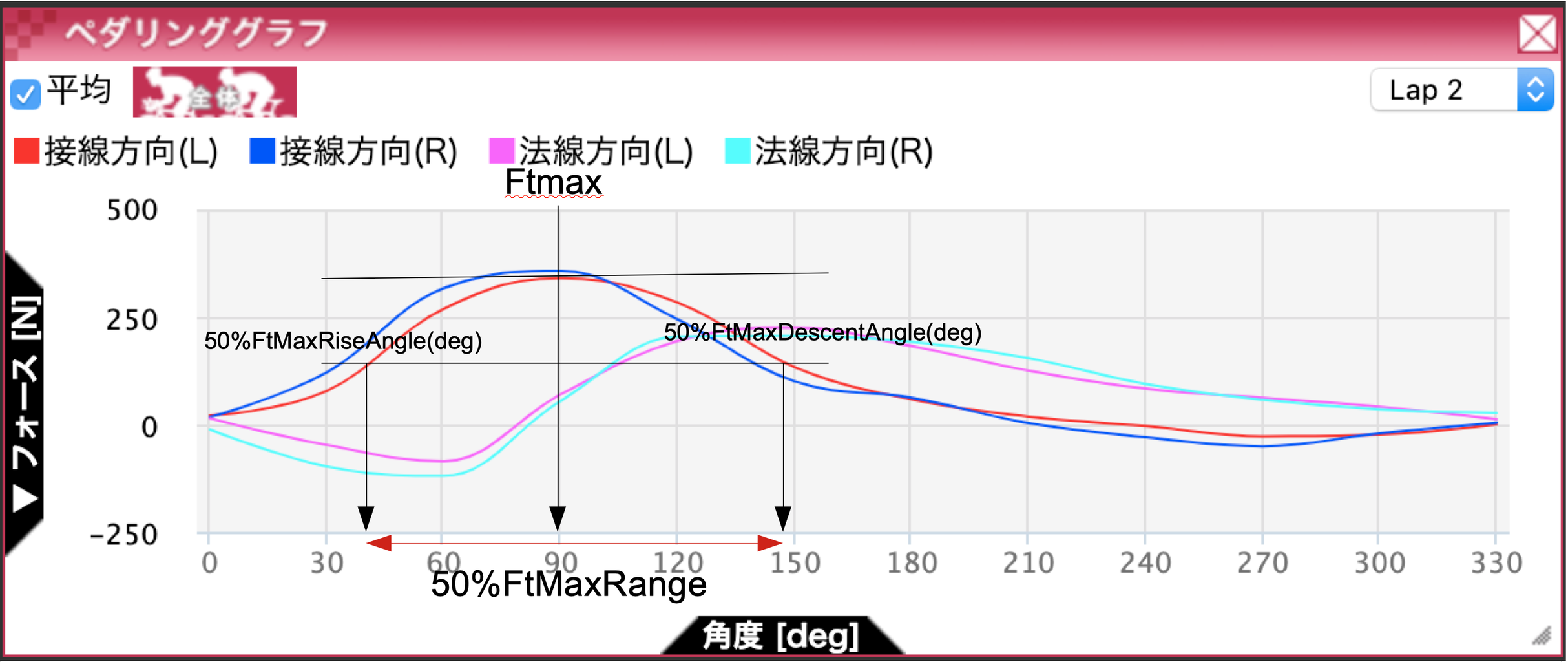 50%FtMax(N)での水平線がペダリンググラフの接線方向(ここでは赤線)と交わる二点を、FtMaxより前にあるものを50%FtMaxRiseAngle(degree)(ここでは45°)、後ろにあるものを50%FtMaxDescentAngle(degree)(ここでは148°)とする。