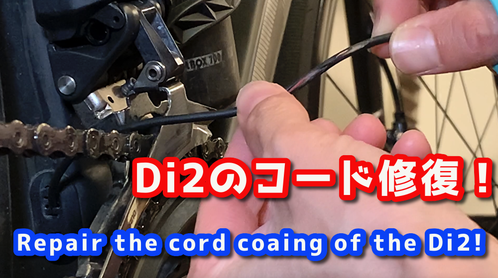 シートチューブから外に出てきてフロントディレーラーに繋がっている Di2ケーブル、どうやら洗車した時に、引っ張ってしまったようで、タイヤと擦れて被覆が剥けちゃった!