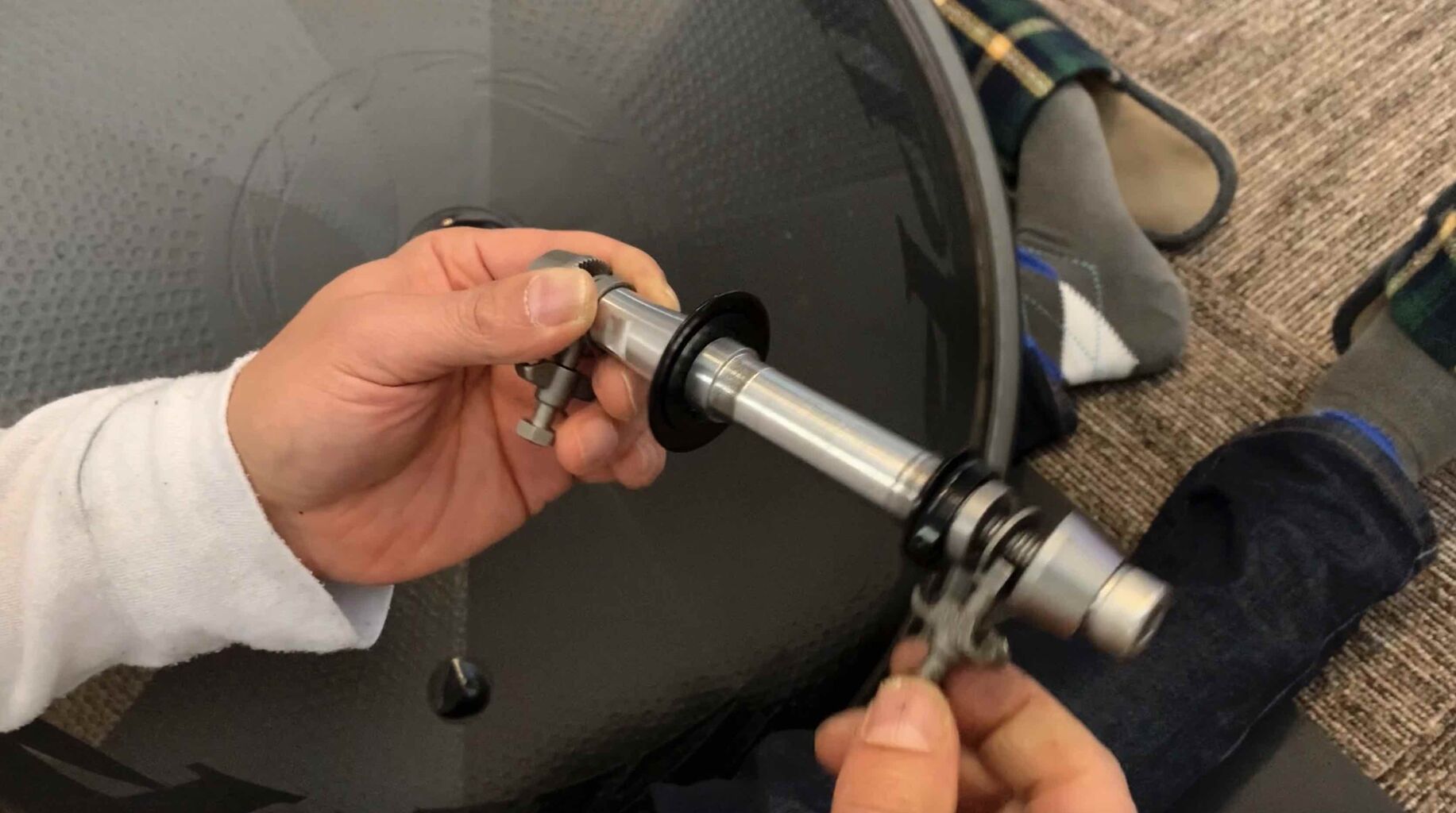 TT バイクを買い替えたら、レースのアップ用に使っているローラー(Feedback sports のportable bike trainer)が使えなくなった。上の絵のごとく、フォークがネジの頭に干渉する。