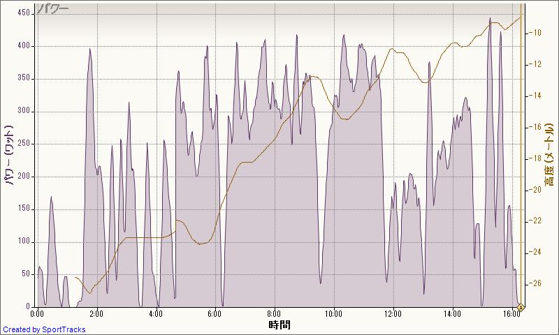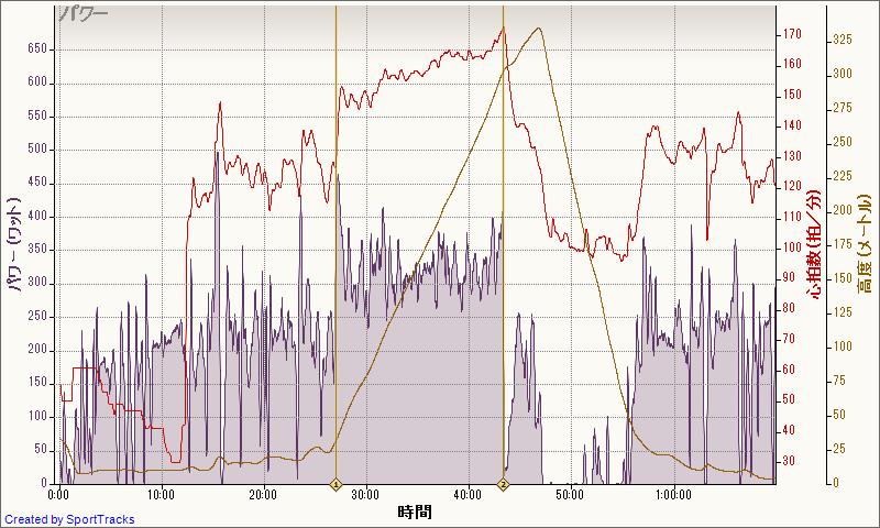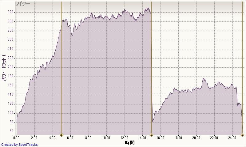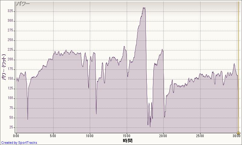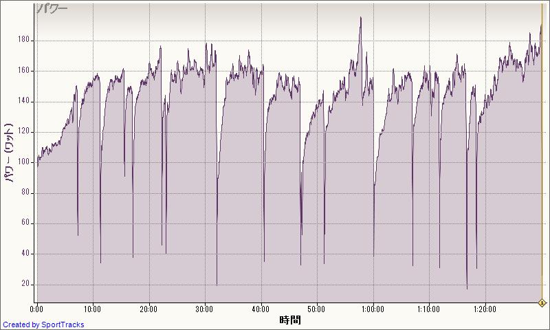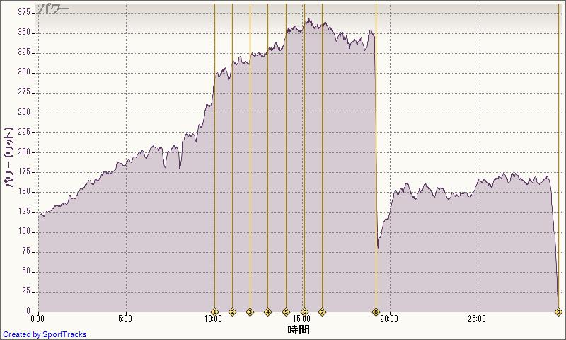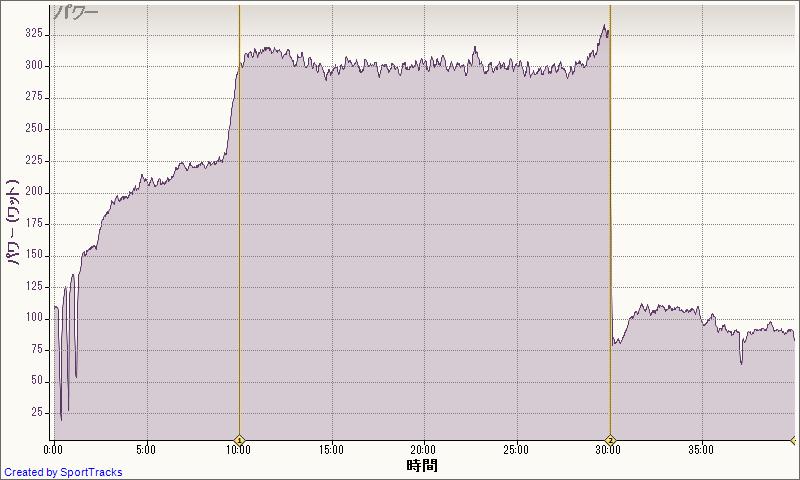 300Wで入って、1分ごとに10Wアップ、360Wでギブ。その後350Wからたれながら3分。